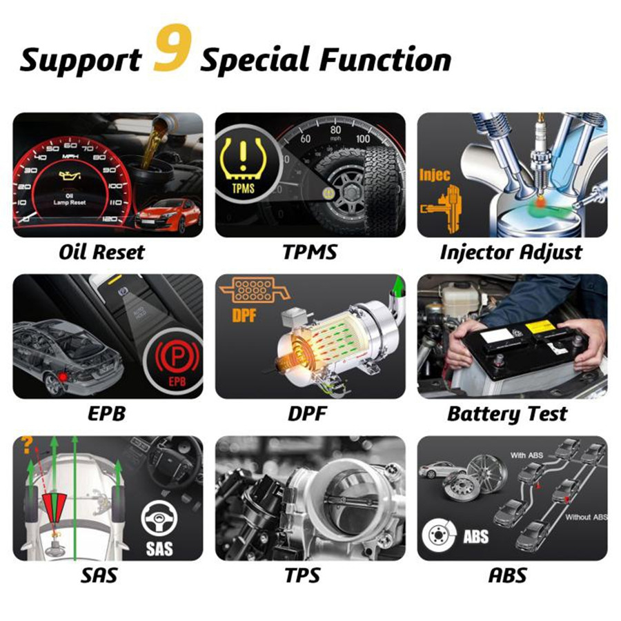 Oil Reset, TPMS, ABS, SAS, TPS, DPF, EPB, Battery Test, Injector Adjust all included to meet your extra demands.