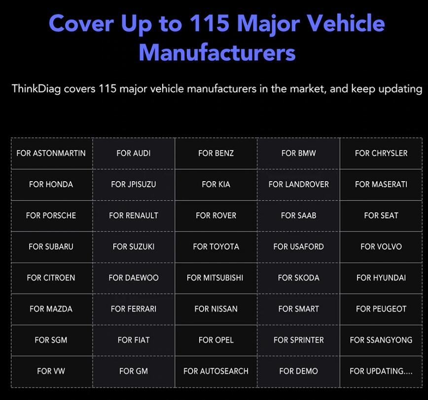 6. Cover Up to 115 Major Vehicle Manufacturers: ThinkDiag covers 115 major vehicle manufacturers in the market, and keep updating