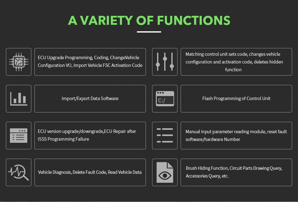 3. Functions including diagnostic, programming, simulation studying, repair information, automotive maintenance, technical service bulletin and so on.